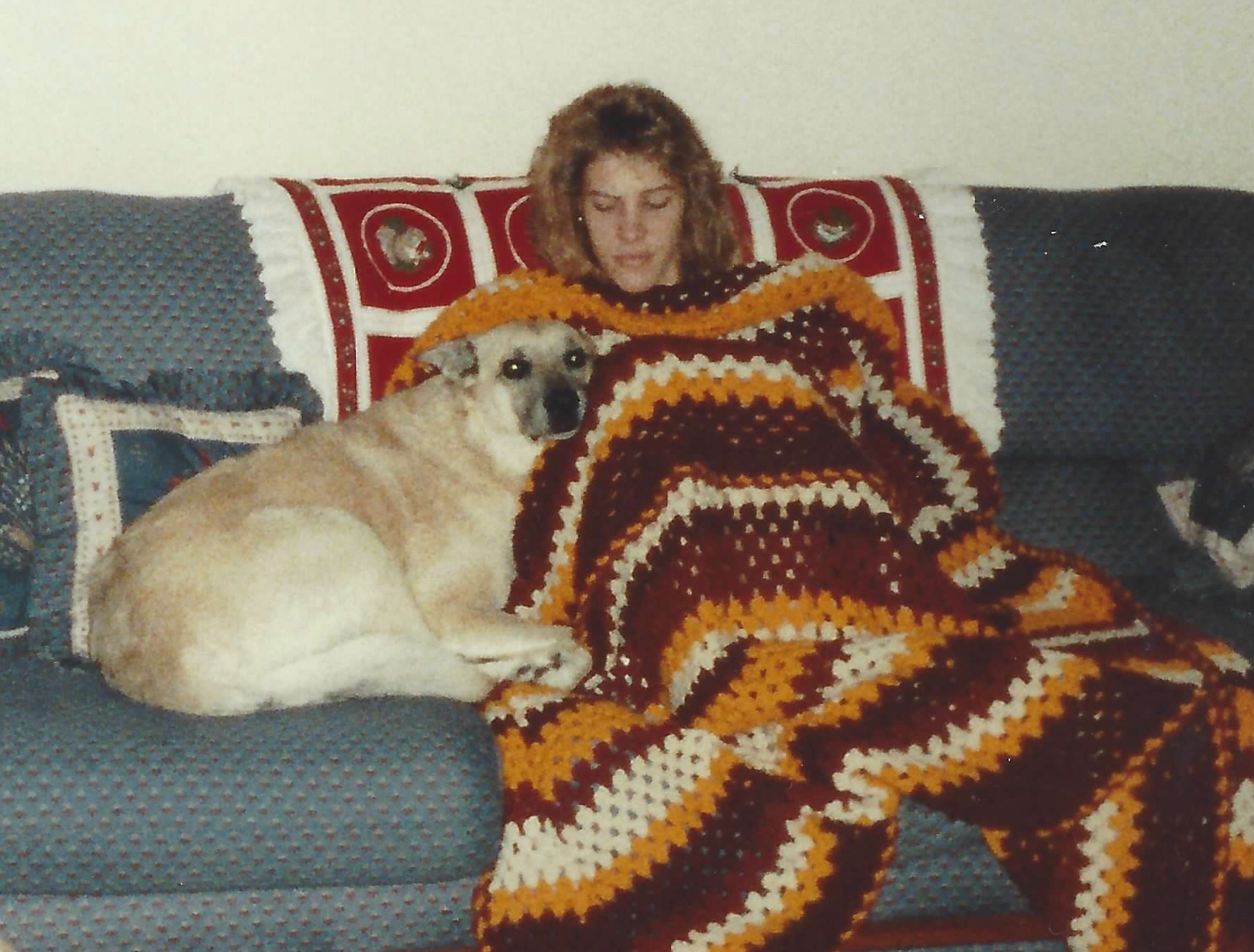 Doesn’t this photo scream the 80s? My hair, the afghan blanket crocheted by Grandma, the patterned couch. I loved snuggling with my dog Sandy on cold winter days.